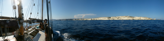 Un pomeriggio dello scorso agosto, un bel pomeriggio di sole e di vento moderato, ero ormeggiato con il mio equipaggio agli scoglietti italiani, sulla costa ovest di Caprera. Bagno, pranzo, pisolino... una giornata apparentemente perfetta; finché non mi sono accorto che c'era qualcosa che non andava con l'alternatore. Che fare? Lasciare gli ormeggi a vela e andare alla Maddalena per vedere di sistemare l'avaria. Il vento era a nostro favore e le manovre sono andate benissimo. Ho chiamato Danilo, skipper del Rubin in quelle settimane, che era in mare con Cris. Stavano arrivando da Cala Coticcio e infatti ci siamo incrociati a nord di Caprera. Le foto che vedete qui accanto sono l'avvicinamento delle nostre barche.